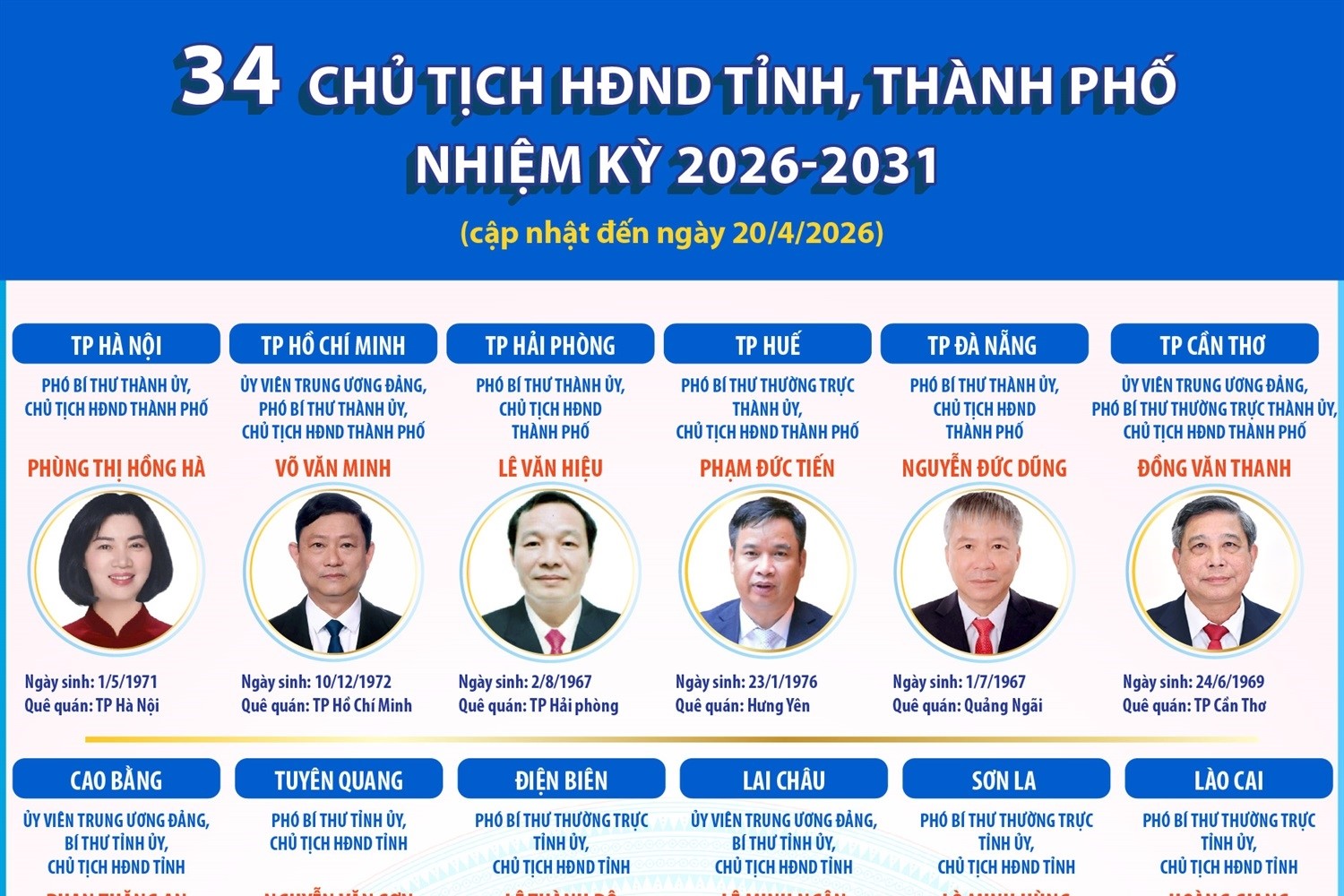 Thông tin về 34 Chủ tịch HĐND tỉnh, thành phố nhiệm kỳ 2026-2031