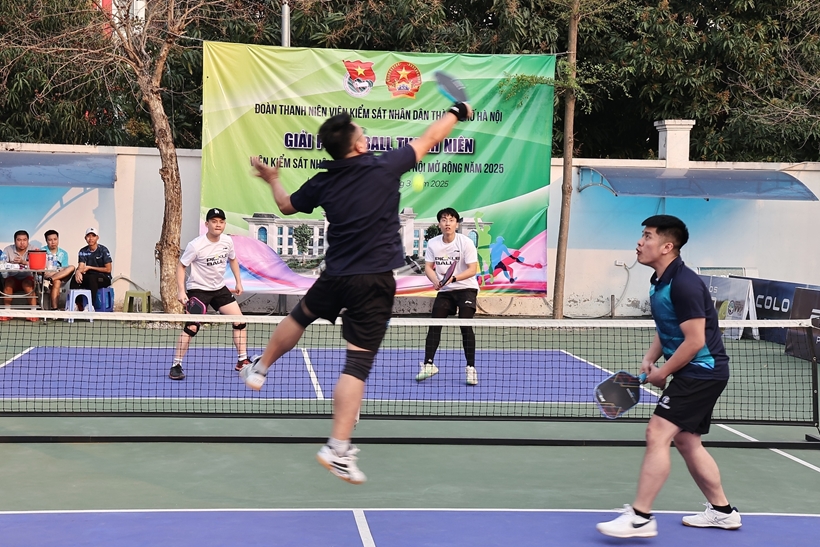 Ấn tượng một pha thi đấu Giải Pickleball thanh niên VKSND TP Hà Nội mở rộng năm 2025. |