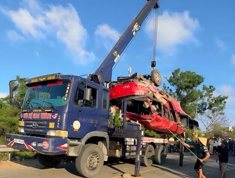 | Chiếc xe khách nát bét được cẩu khỏi hiện trường. |