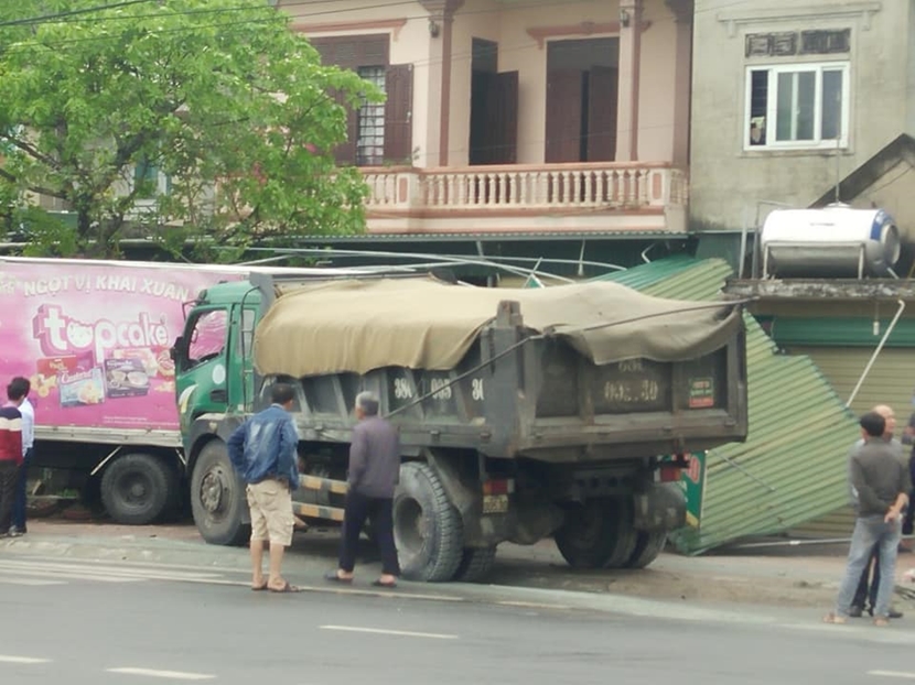 | Tại xã Cẩm Vịnh, Cẩm Xuyên một xe tải mất lái đã đâm vào xe tải đậu trên vỉa hè và làm sập mái xe của nhà dân |