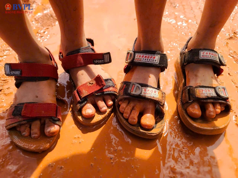 | Chân của các em đi học về, mới đi được một đoạn đường đã lấm lem bùn đất. |