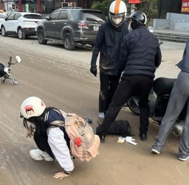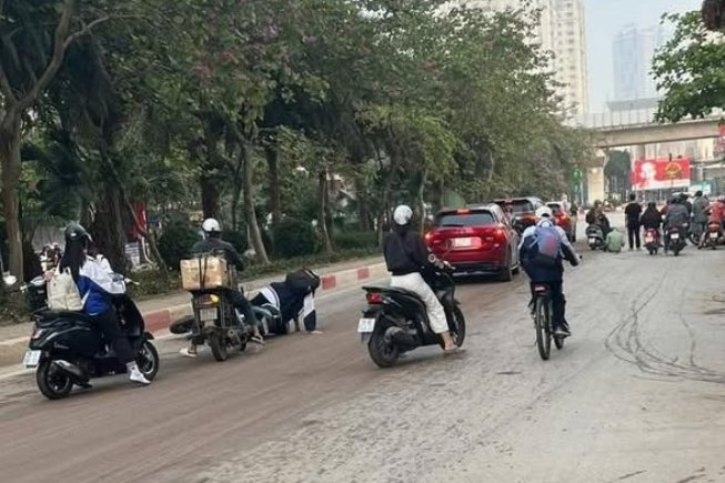 | Sáng 18/3, do bùn đất rơi vãi khiến nhiều người đi xe máy bị trơn trượt, ngã chồng lên nhau trước số nhà 229-233 phố Quang Trung, phường Hà Đông. |