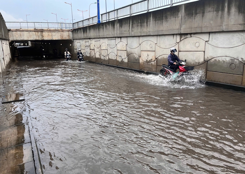 Chiều 28/10/2025, sau cơn mưa lớn, bên trong hầm chui trước Bến xe Miền Đông mới, phường Long Bình, TP Hồ Chí Minh lại ngập nước, nhiều người đi xe máy phải quay đầu.