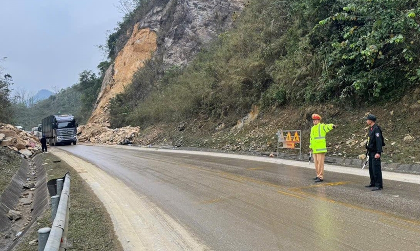 | Lực lượng chức năng tiến hành điều tiết giao thông đoạn qua điểm sạt lở. |