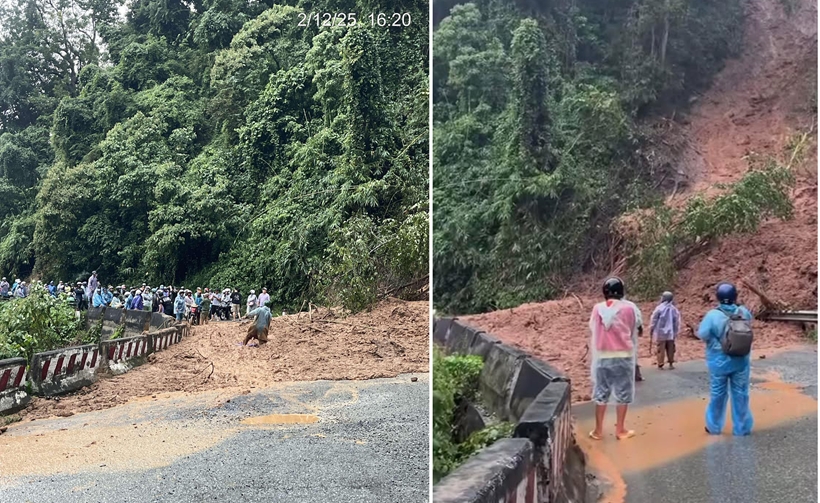 Mưa lớn gây sạt lở ta luy dương trên đèo Sông Pha trên QL 27, đoạn qua xã Lâm Sơn (Khánh Hòa), gây chia cắt giao thông tạm thời.