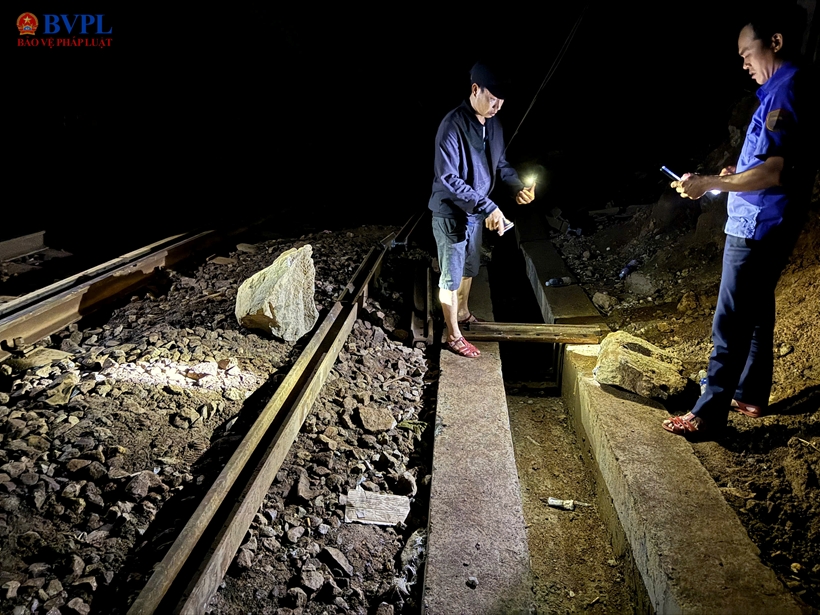 | Nhân viên đường sắt túc trực tại hiện trường để theo dõi nguy cơ đá rơi và đảm bảo an toàn cho tuyến đường sắt Bắc – Nam. |