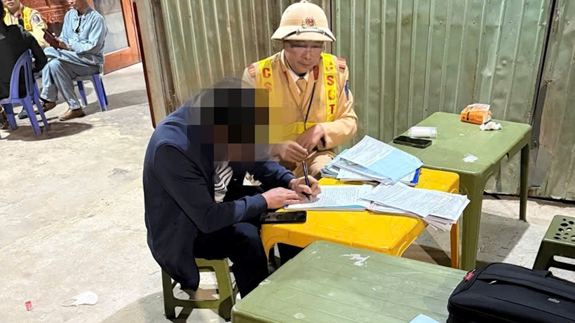 | Lực lượng chức năng lập biên bản xử phạt hành chính đối với nam tài xế. Ảnh: CATN |