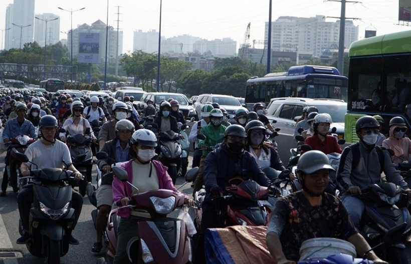 Do tai nạn xảy ra vào giờ cao điểm dẫn đến ùn ứ trong làn ôtô từ cầu vượt Cát Lái đến cầu Sài Gòn, giao thông trên tuyến đường Võ Nguyên Giáp cũng bị ảnh hưởng.
