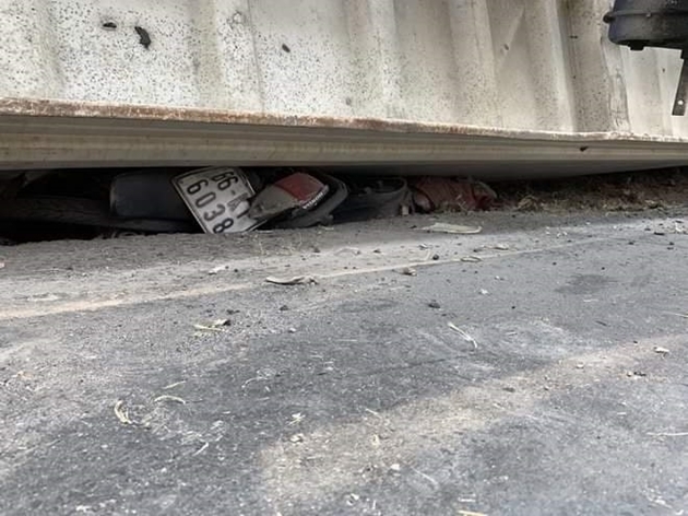 Đến xã Bình Thạnh, xe container bất ngờ mất lái, làm phần rơ-móc kéo phía theo bị lật sang bên phải, đè lên xe máy mang biển số 66k1 6038.