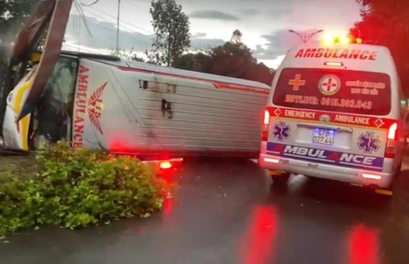 Khi đến đoạn qua thị trấn Kiến Đức (huyện Đắk R’lấp), tài xế xe cứu thương bất ngờ mất lái lao lên dải phân cách giữa đường rồi tông vào trụ đèn chiếu sáng, lật qua phần đường theo hướng lưu thông ngược lại.