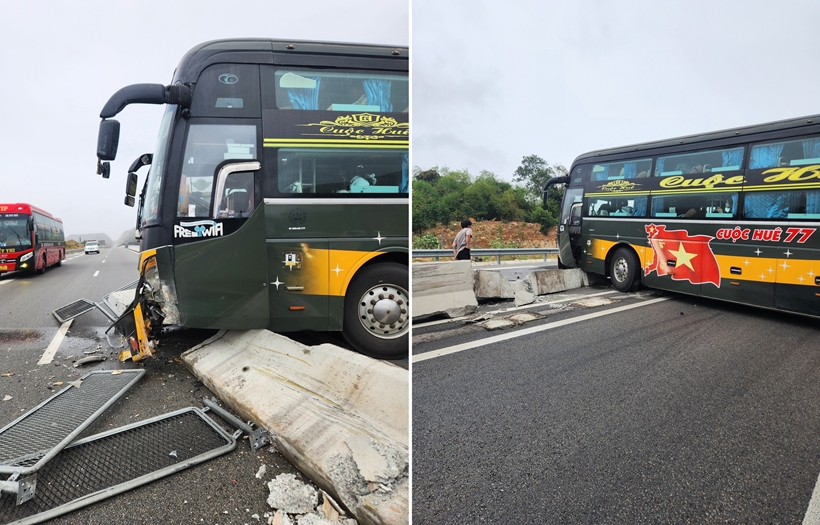 Chạy tốc độ cao trên cao tốc trong điều kiện trời có mưa, chiếc xe khách bất ngờ mất lái, xoay ngang, ủi dải phân cách cứng giữa đường.