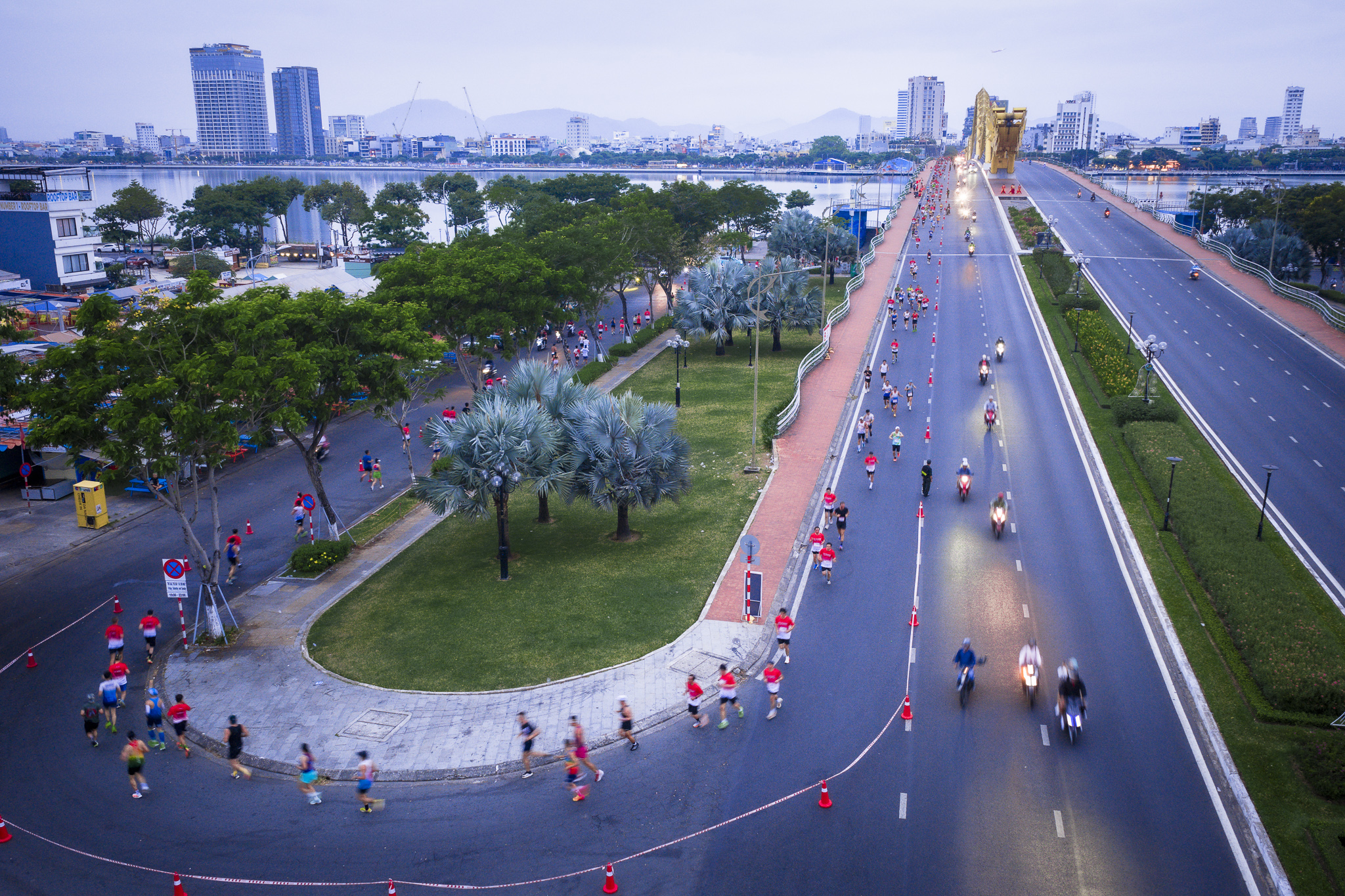 Từ sáng sớm, các vận động viên có mặt tại Công viên Biển Đông tham gia tranh tài, bắt đầu cuộc đua từ rạng sáng trong khung cảnh bình minh trên biển Đà Nẵng, lần lượt chinh phục cung đường chạy qua các tuyến phố ven biển và những cây cầu biểu tượng của thành phố.