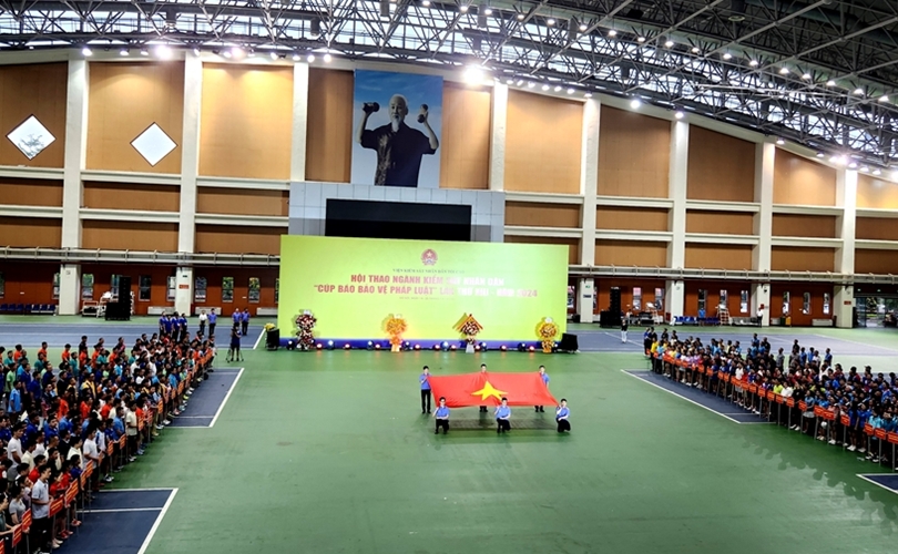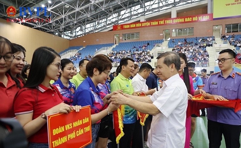 Đồng chí Lê Minh Trí, Viện trưởng VKSND tối cao trao cờ lưu niệm tặng các Đoàn vận động viên.