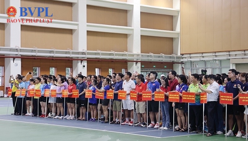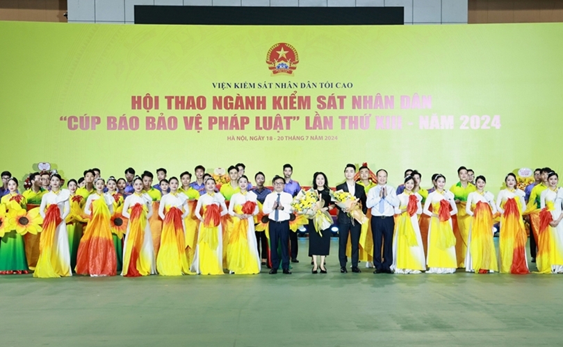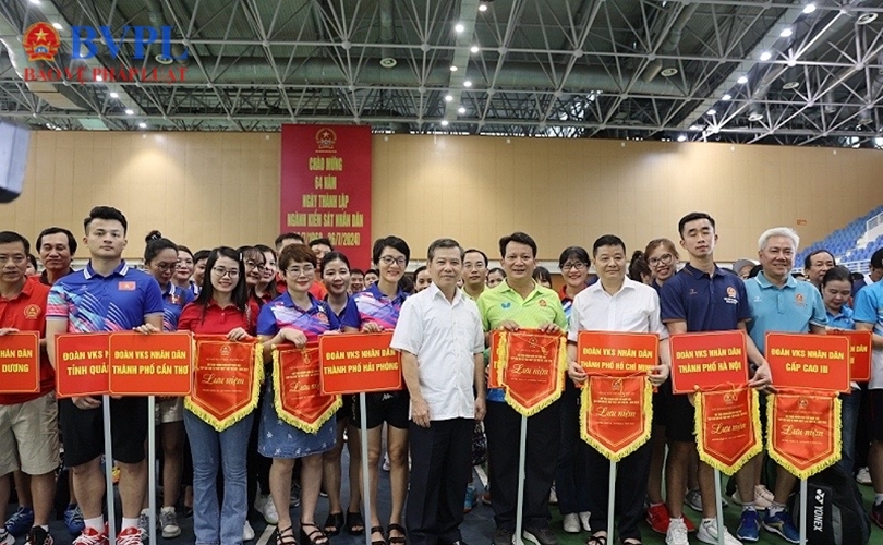 Đồng chí Lê Minh Trí, Viện trưởng VKSND tối cao trao cờ lưu niệm và chụp ảnh lưu niệm cùng các Đoàn vận động viên.