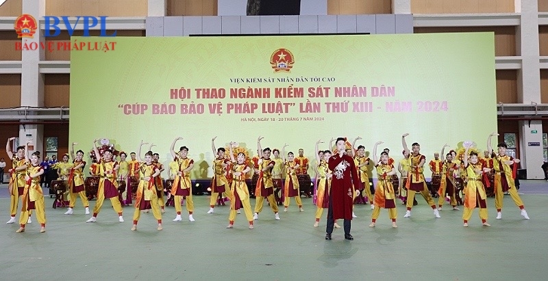 Đồng chí Nguyễn Văn Thắng, Tổng Biên tập Báo Bảo vệ pháp luật, Trưởng Ban tổ chức Hội thao; đồng chí Đào Thịnh Cường, Viện trưởng VKSND thành phố Hà Nội, Phó trưởng Ban Tổ chức Hội thao tặng hoa chúc mừng Đội văn nghệ.
