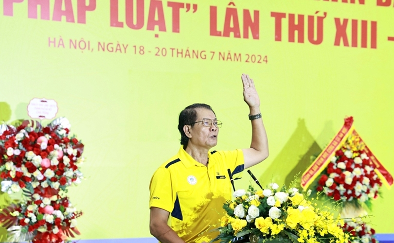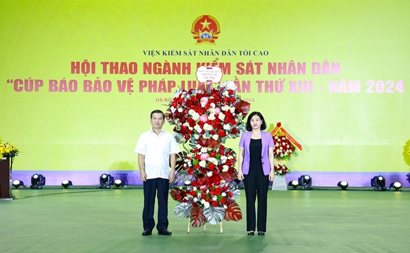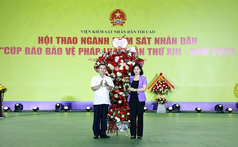 Đồng chí Nguyễn Thị Tuyến, Ủy viên Trung ương Đảng, Phó Bí thư Thường trực Thành ủy Hà Nội tặng lẵng hoa tươi thắm đồng chí Lê Minh Trí, Ủy viên Trung ương Đảng, Bí thư Ban cán sự Đảng, Viện trưởng VKSND tối cao, chúc mừng Hội thao.