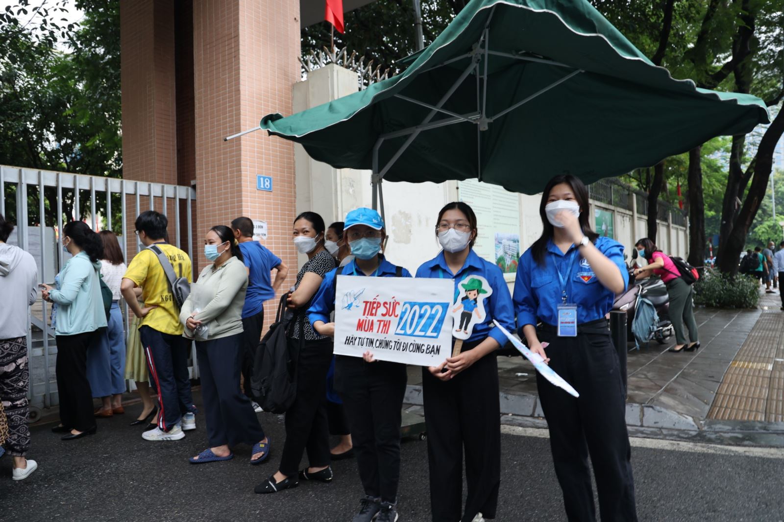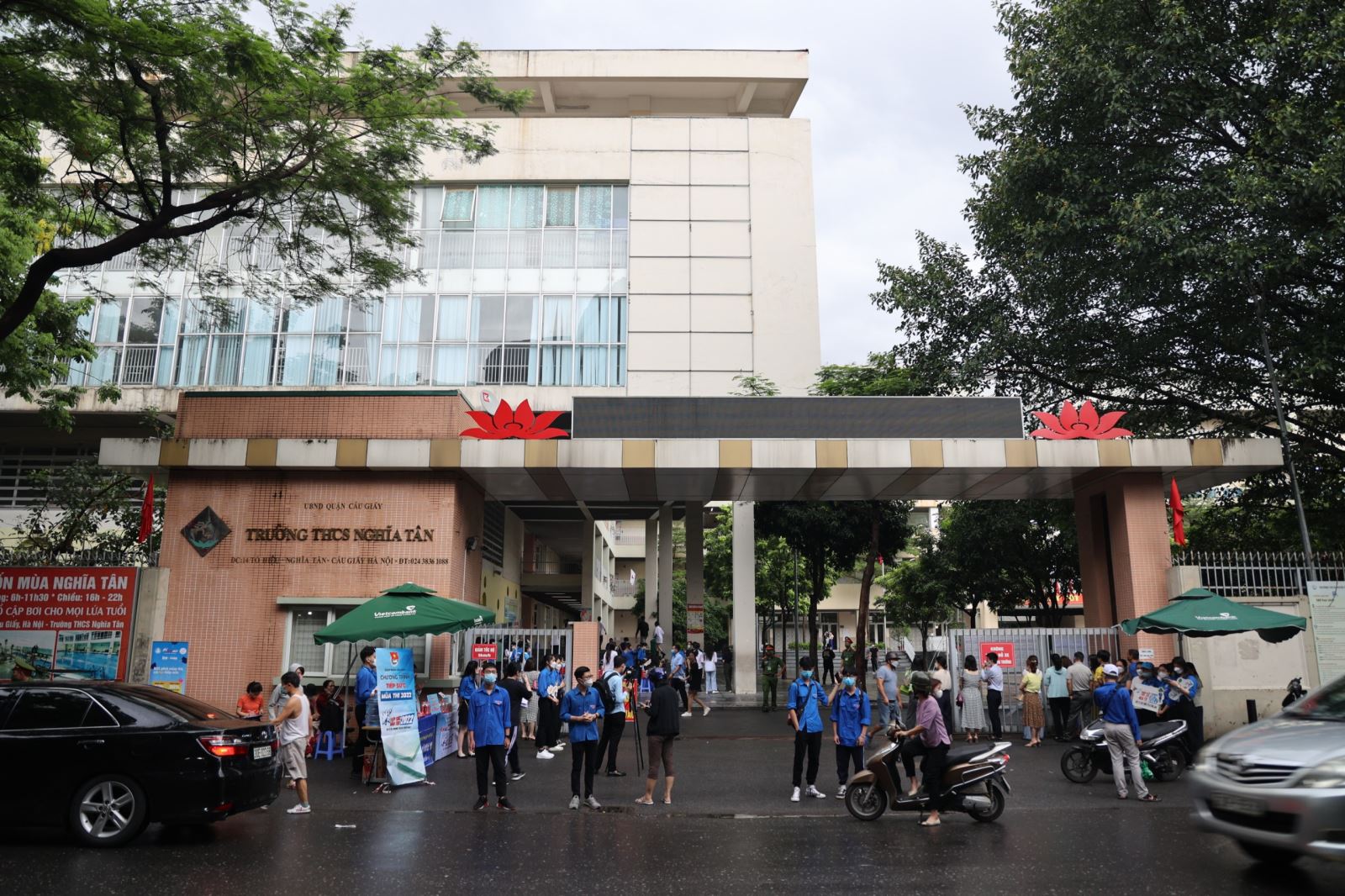 Tại điểm thi trường THCS Nghĩa Tân, Cầu Giấy, Hà Nội, lực lượng tình nguyện hỗ trợ nhiệt tình các thi sinh, từ cổng trường vào đến chỗ để đồ vào phòng thi.