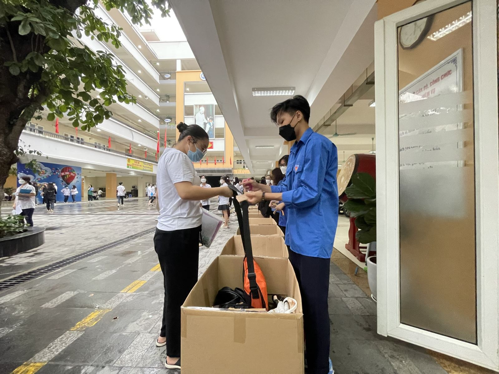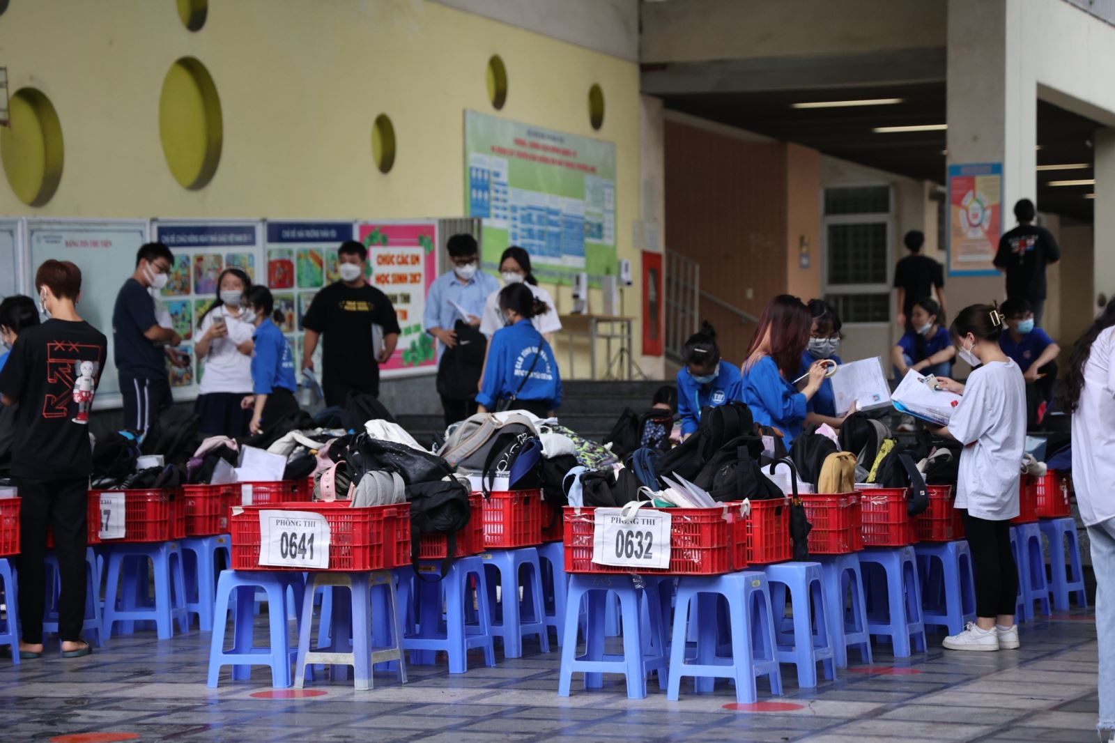 Lực lượng tình nguyện viên trông đồ cho các thí sinh để vào trường thi.