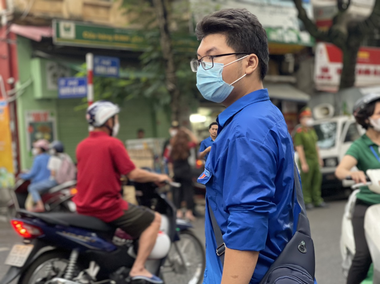 Tại điểm thi trường Ngô Sĩ Liên, Hoàn Kiếm, Hà Nội, lực lượng tiếp sức mùa thi hỗ trợ phân luồng giao thông, tránh ùn tắc, đảm bảo thí sinh vào phòng thi được an toàn.