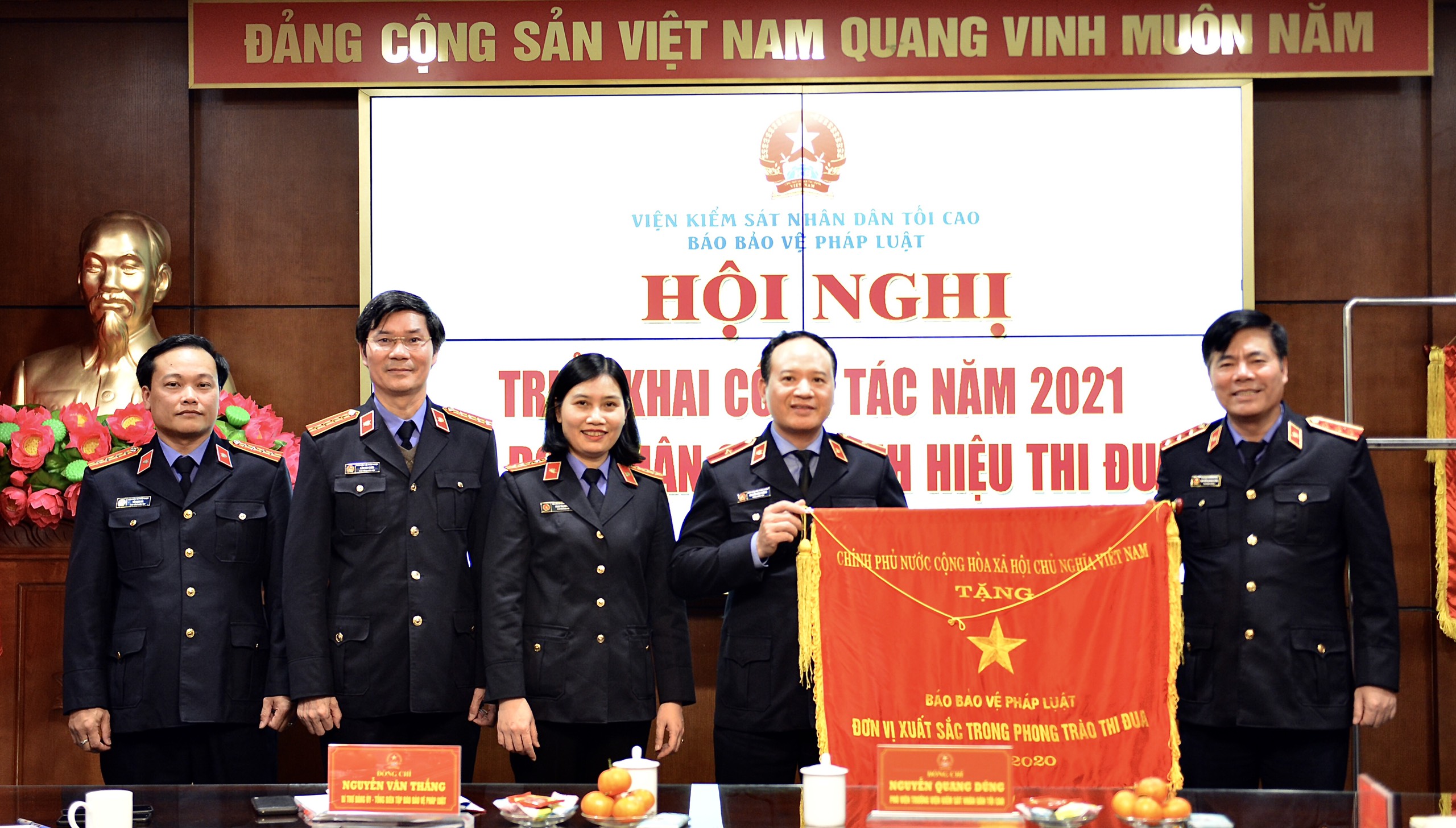 Lãnh đạo VKSND tối cao trao Cờ Đơn vị xuất sắc phong trào thi đua năm 2013 của VKSND tối cao tặng Báo Bảo vệ pháp luật.