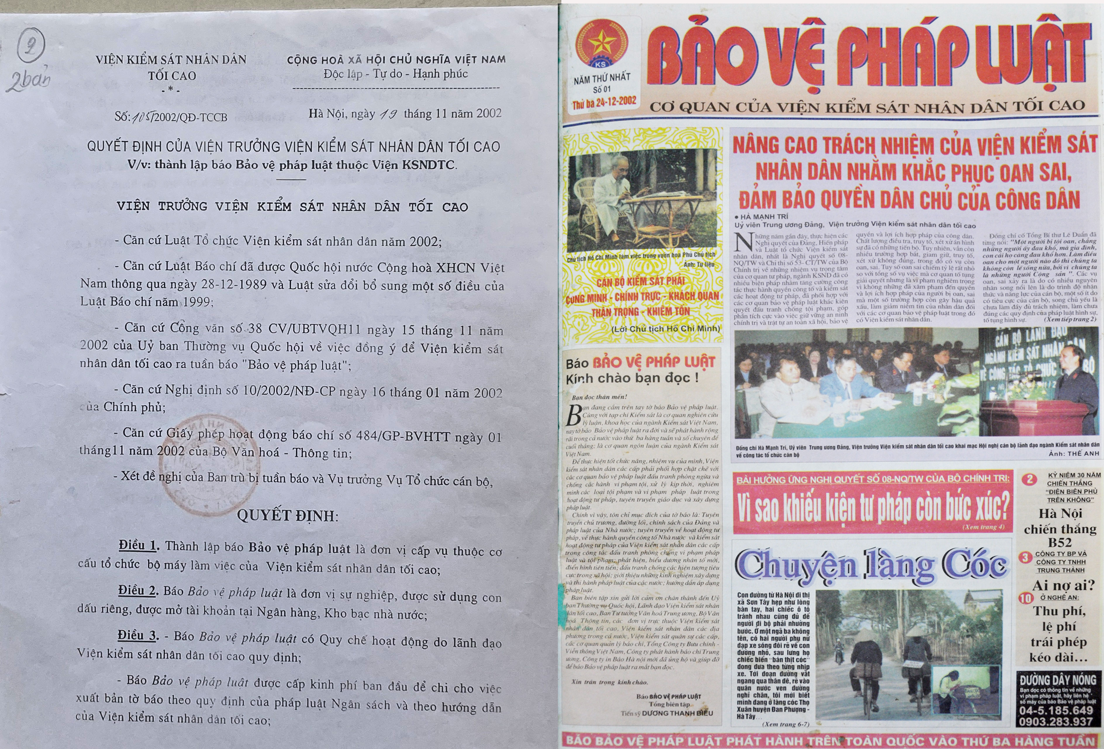 Quyết định của Viện trưởng Viện kiểm sát nhân dân tối cao về việc thành lập Báo Bảo vệ pháp luật (năm 2002) và trang nhất Báo Bảo vệ pháp luật số 01 (ra ngày 24/12/2002).