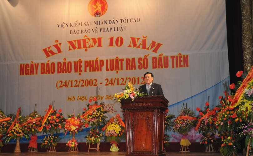 Đồng chí Nguyễn Hòa Bình - Viện trưởng VKSND tối cao phát biểu tại Lễ kỷ niệm 10 năm ngày Báo Bảo vệ pháp luật ra số đầu tiên (ngày 26/12/2012).