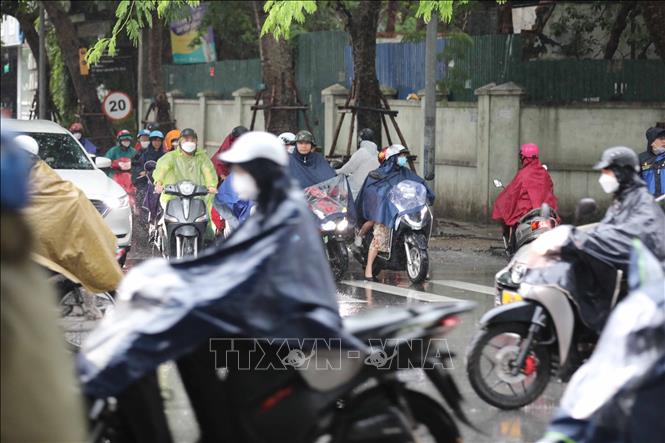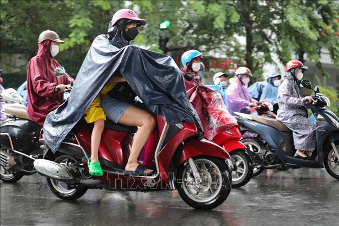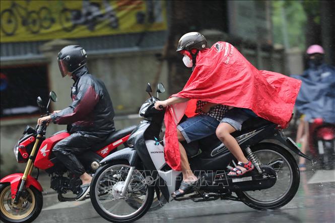 Người dân Hà Nội mặc áo mưa di chuyển trong cơn mưa sáng 11/8.