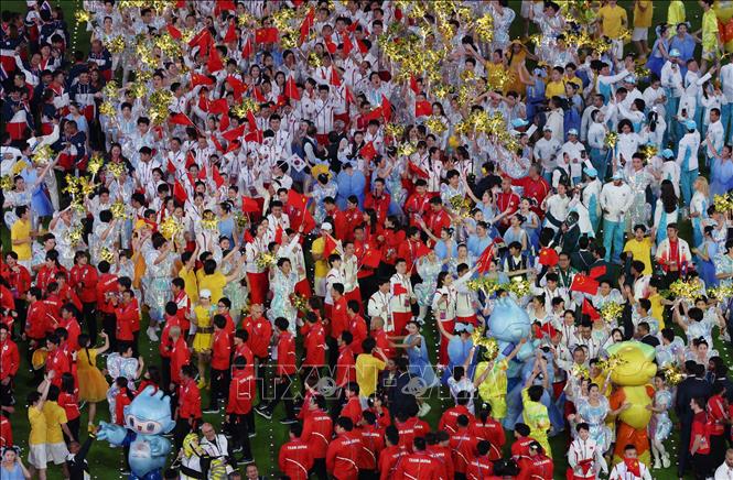 Các đoàn thể thao diễu hành vào sân vận động Olympic Hàng Châu trong lễ bế mạc ASIAD 2023. Ảnh: THX/TTXVN