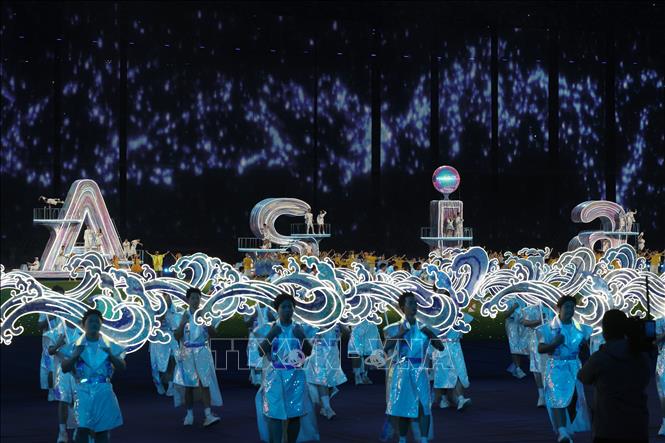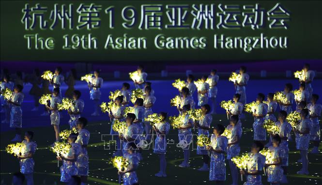 Tiết mục biểu diễn nghệ thuật đặc sắc tại lễ bế mạc ASIAD 2023 trên sân vận động Olympic Hàng Châu tối 8/10/2023. Ảnh: THX/TTXVN