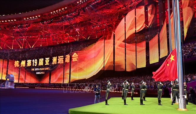 Nghi thức thượng cờ Trung Quốc tại lễ bế mạc ASIAD 2023 trên sân vận động Olympic Hàng Châu. Ảnh: THX/TTXVN