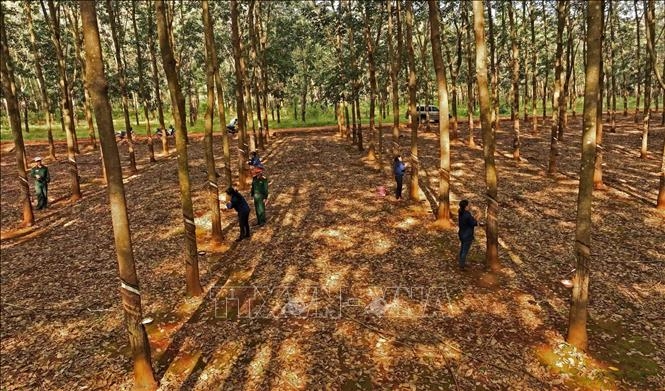 Thu hoạch mủ cao su ở nông trường của Công ty TNHH MTV 72 (Binh đoàn 15), ở xã Ia Nan, huyện Đức Cơ, tỉnh Gia Lai.