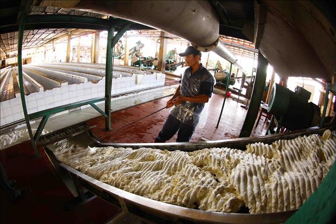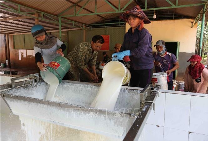 Chế biến mủ cao su ở nhà máy của Công ty TNHH MTV 72 (Binh đoàn 15), xã Ia Nan, huyện Đức Cơ, tỉnh Gia Lai.