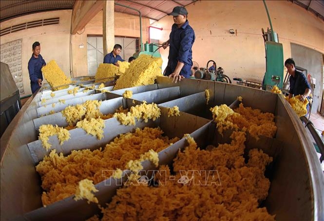 Chế biến mủ cao su phục vụ xuất khẩu ở nhà máy của Công ty TNHH Một thành viên 72 (Binh đoàn 15), xã Ia Nan, huyện Đức Cơ, tỉnh Gia Lai.