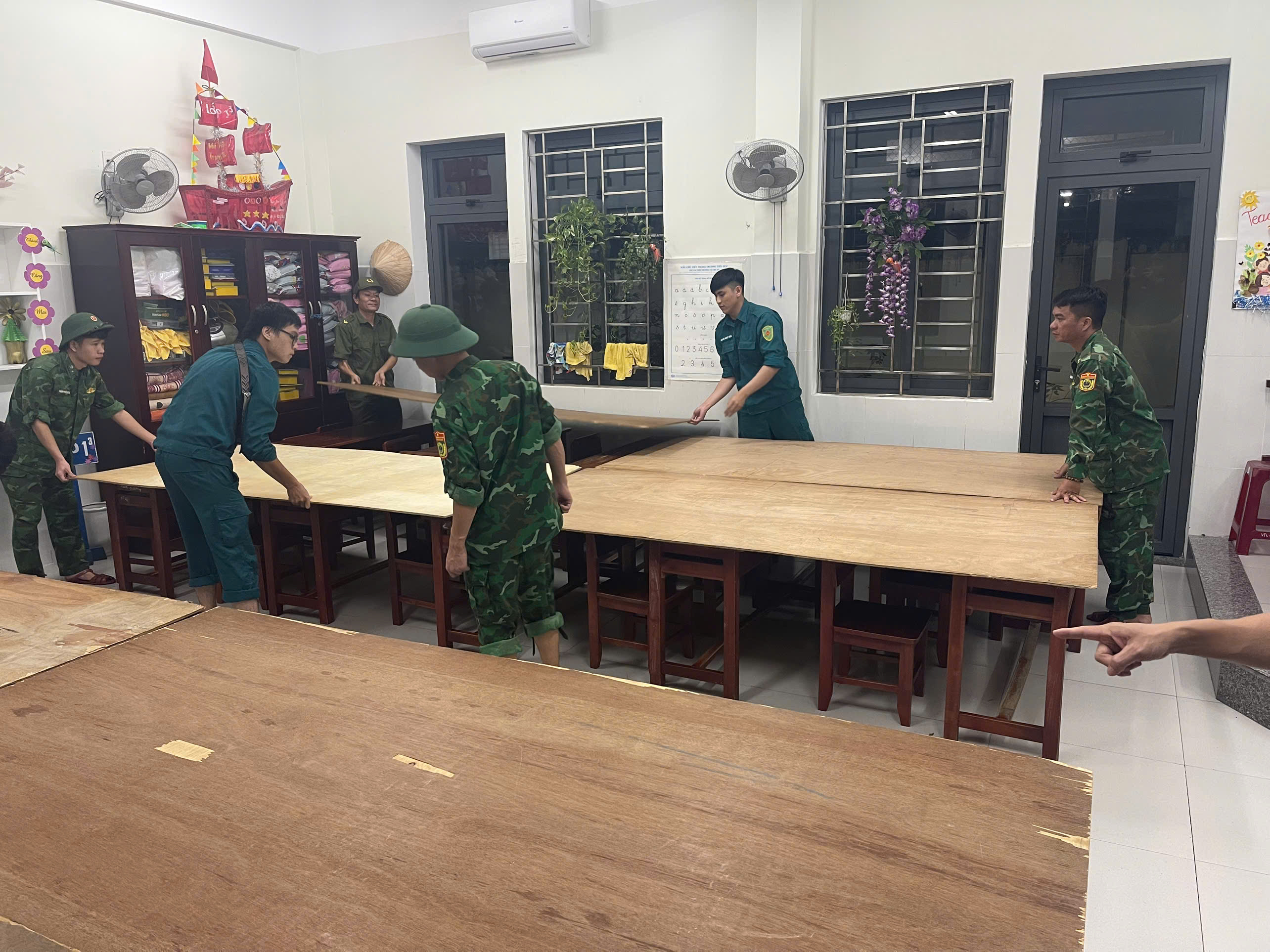 Bên cạnh đó, các tình nguyện viên cũng hỗ trợ lực lượng chức năng dọn dẹp các trường học, trụ sở cơ quan... để chuẩn bị các điểm tránh trú bão cho người dân ở các khu trọ, khu nhà tạm, các ngôi nhà không kiên cố... đến trú ẩn.