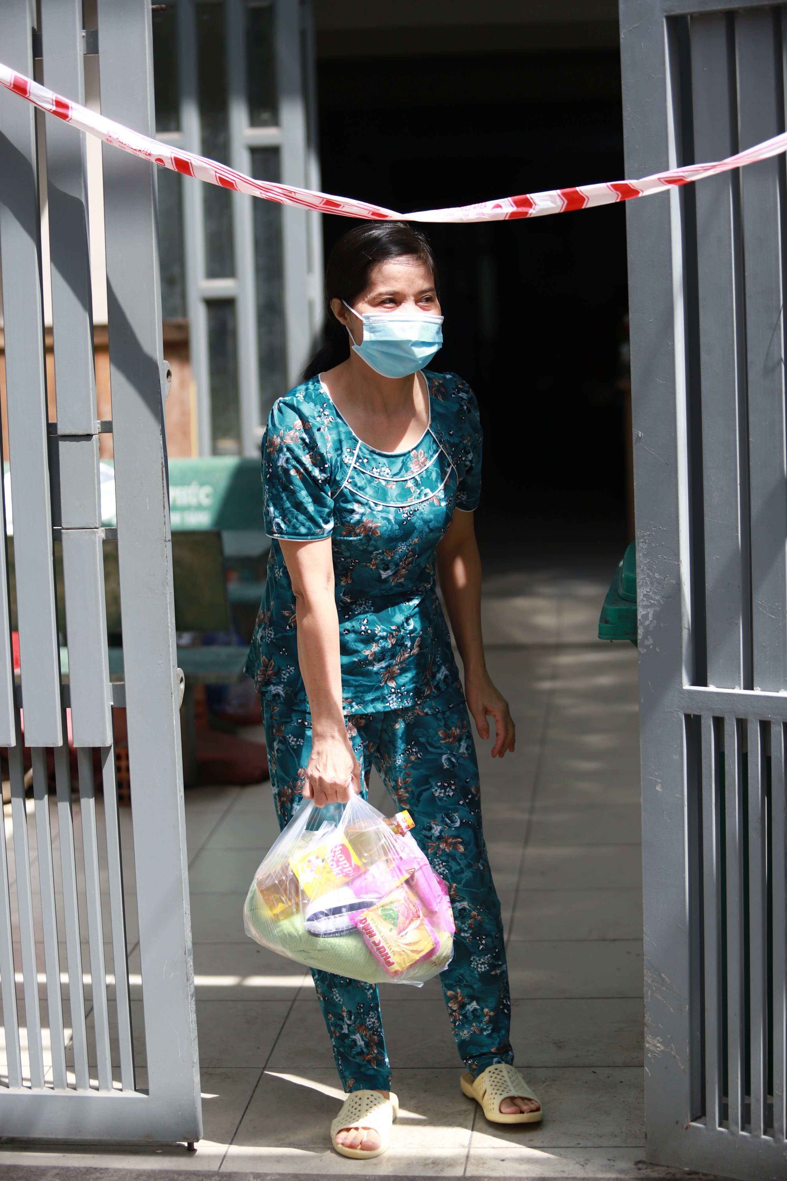 Cán bộ, học viên mặc đồ đồ bảo hộ, mang kính ngăn giọt bắn trao thức ăn đến tận gia đình F0 trong con hẻm ở phường 14.