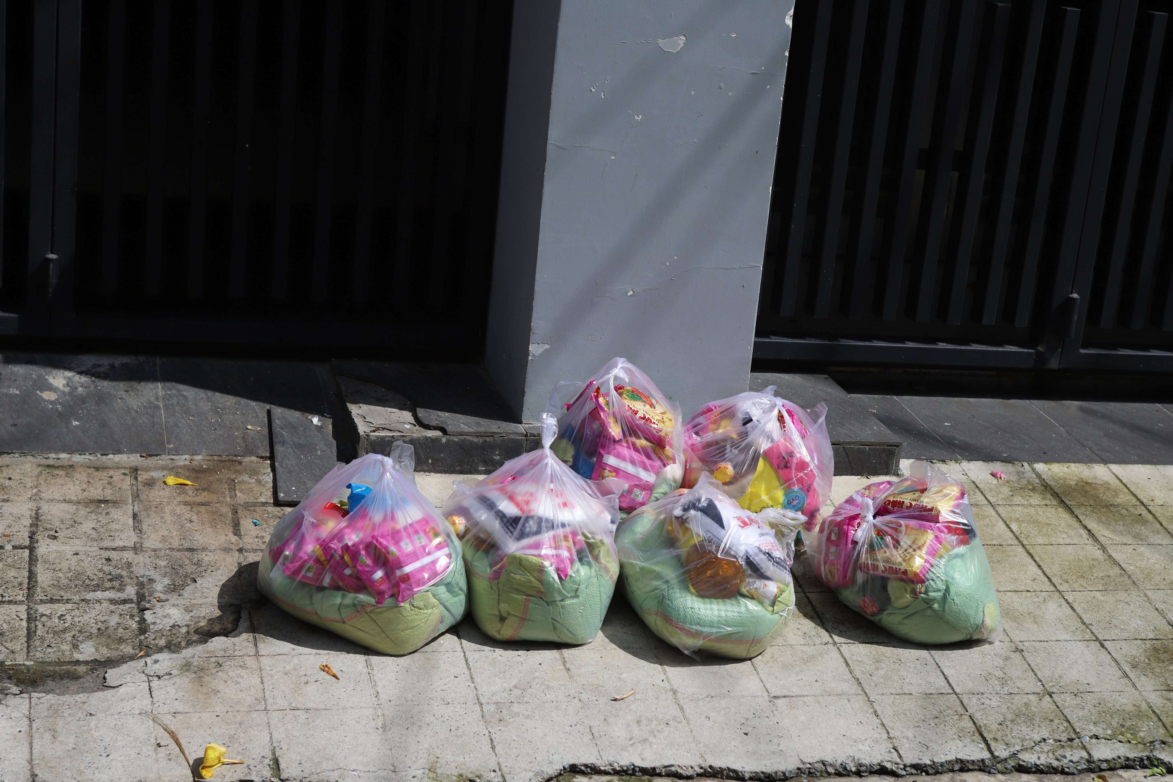 Mỗi phần quà gồm gạo, dầu ăn, nước mắn, thực phẩm để vào các túi nylon, gói ghém cẩn thận trước khi trao cho gần 100 hộ dân.