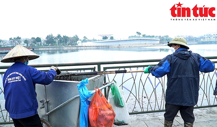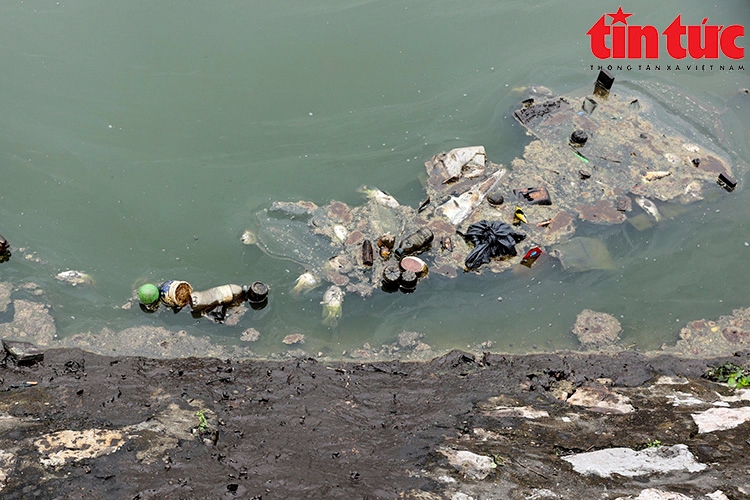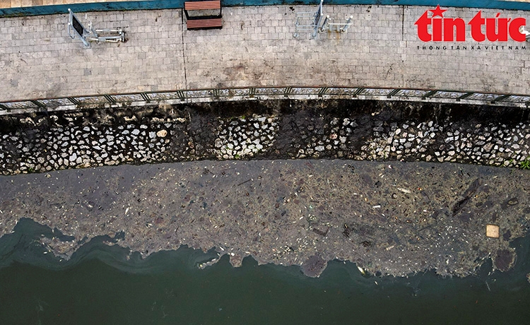 Xác cá, rác thải theo hướng gió và dòng nước dạt vào một góc hồ Bách Hợp Thủy, bốc mùi hôi tanh nồng nặc.