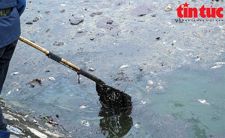Ngoài cá chết, trên mặt nước xuất hiện khá nhiều váng dầu.