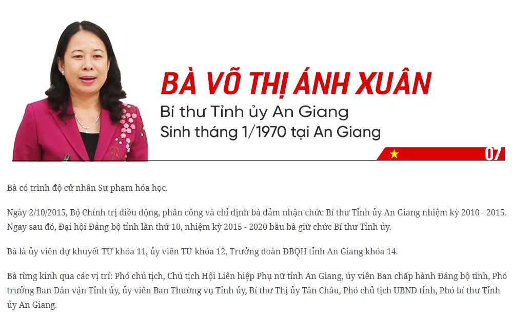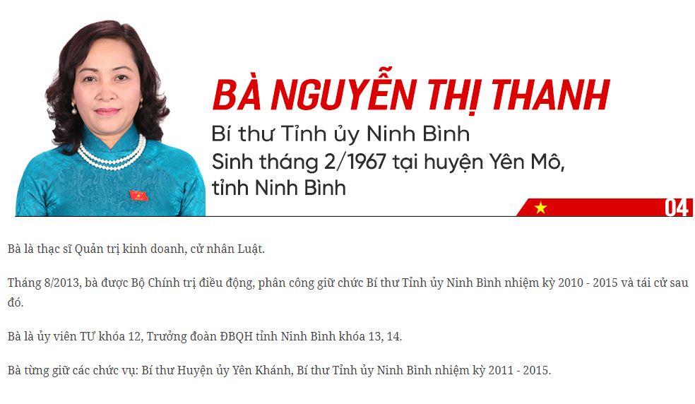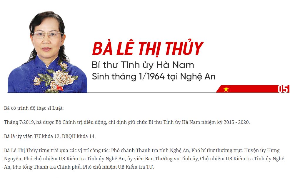 Với quyết định tuần qua của Bộ Chính trị điều động, chỉ định bà Lê Thị Thủy giữ chức Bí thư Tỉnh ủy Hà Nam nhiệm kỳ 2015-2020, cả nước đã có 7 Bí thư Tỉnh ủy là nữ.