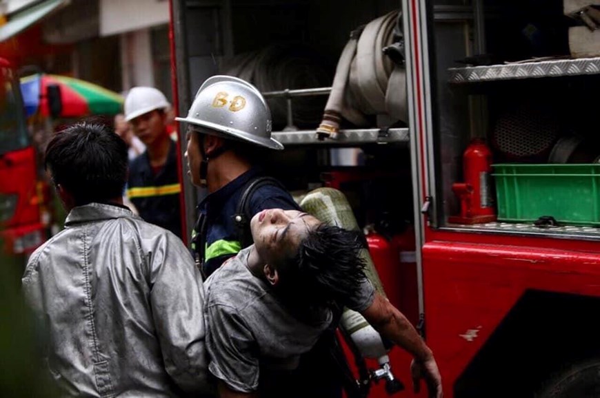 Nạn nhân cuối cùng được đưa ra khỏi đám cháy. (Ảnh: Dương Giang/TTXVN)