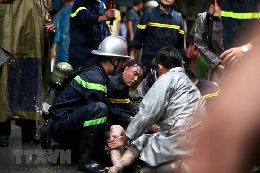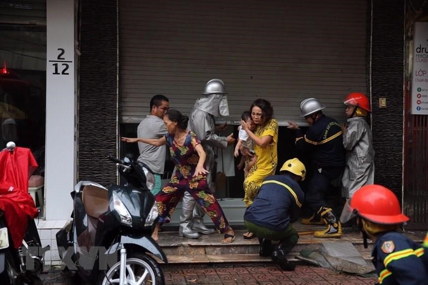 Lực lượng chữa cháy đưa người dân ra khỏi hiện trường. (Ảnh: Dương Giang/TTXVN)