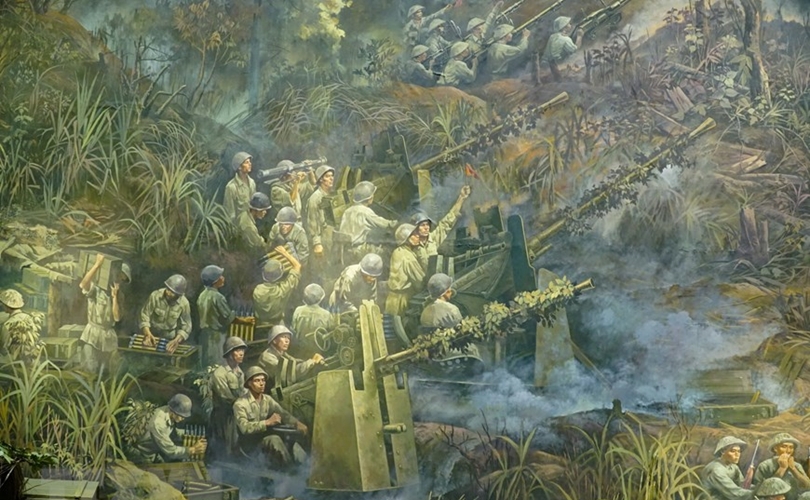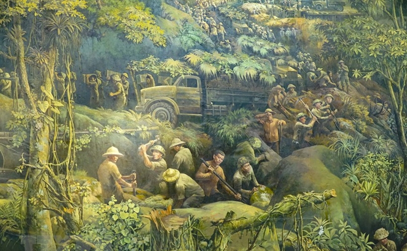 Hình ảnh kéo pháo vào trận địa được kết hợp giữa tranh vẽ và tạo hình bằng hiện vật. (Ảnh: Xuân Tư/TTXVN)
