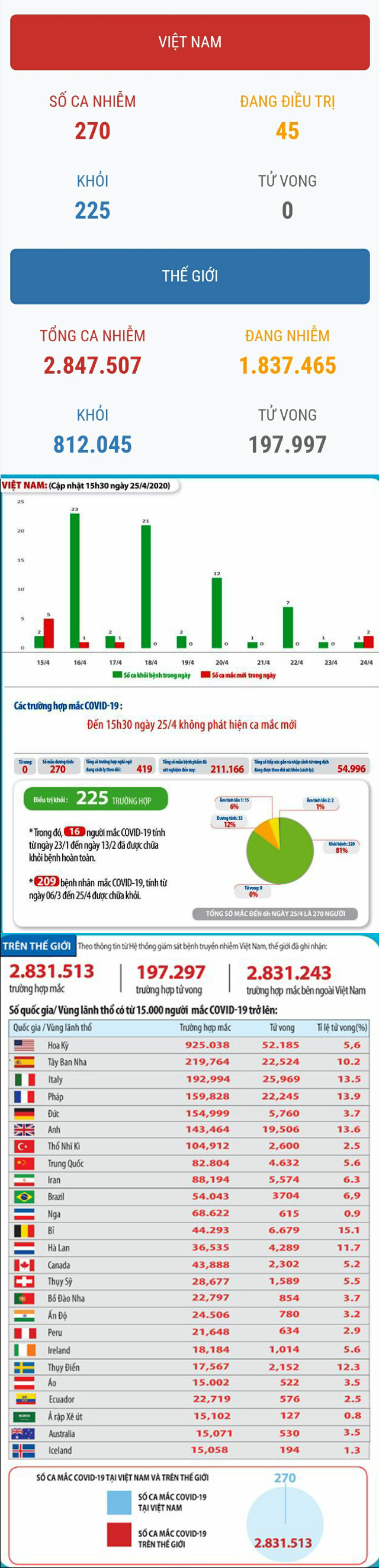 (BVPL) - Theo thông tin mới nhất từ Bộ Y tế, cập nhật tới 18h ngày 24/4/2020, Việt Nam không ghi nhận thêm ca nhiễm COVID-19 mới, tổng số ca mắc giữ nguyên ở con số 270 ca. Trong số các ca nhiễm này, hiện đã có 225 trường hợp khỏi bệnh và được cho xuất viện tự cách ly tại cộng đồng theo quy định. Tình hình dịch COVID-19 trên thế giới tiếp tục diễn biến phức tạp, hiện số ca mắc trên toàn thế giới đã lên tới con số gần 3 triệu ca, con số tử vong do dịch đã lên tới gần 200 nghìn người.