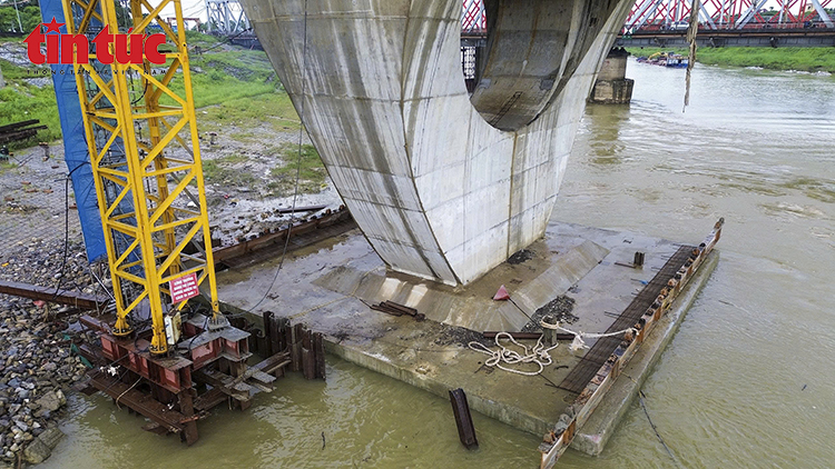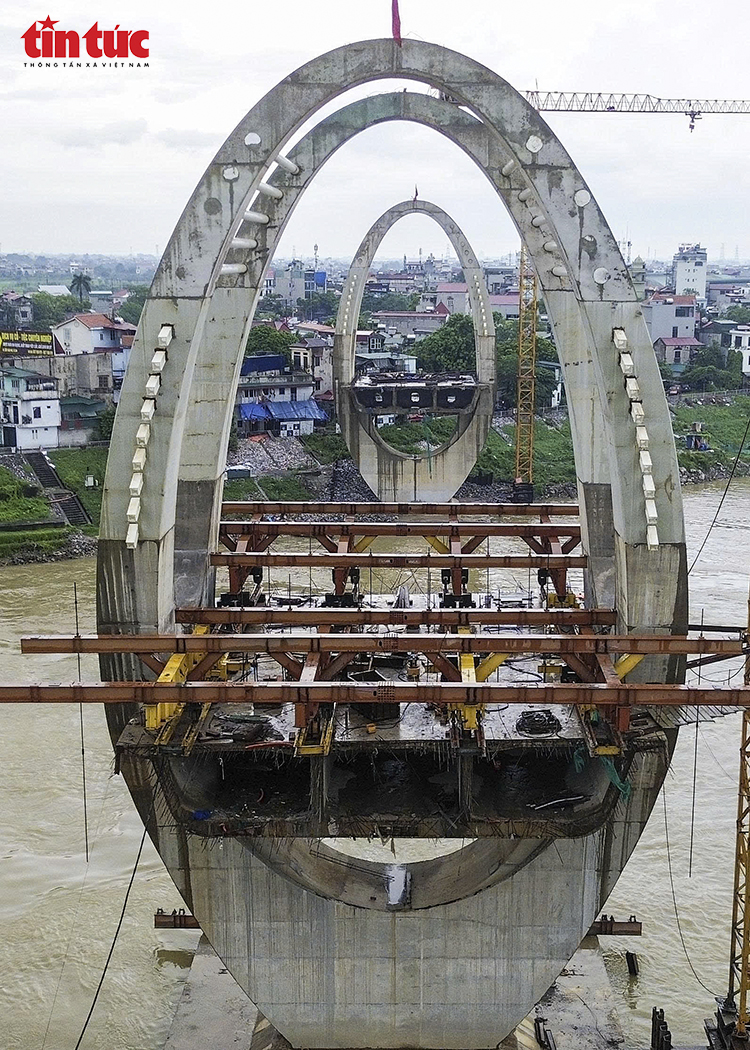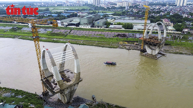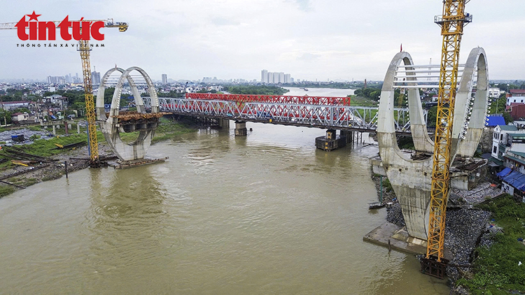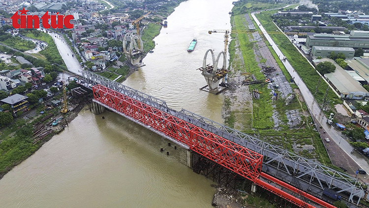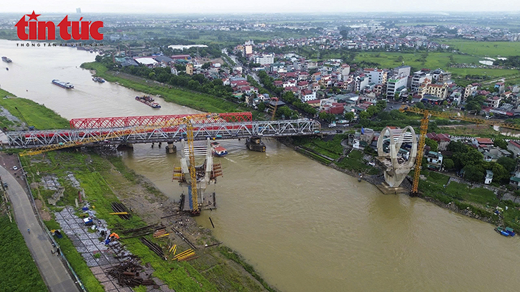 Sau hơn 2 năm thi công, cầu qua sông Đuống, gồm cầu đường sắt và cầu đường bộ, có tổng vốn đầu tư gần 1.850 tỷ đồng, đang dần thành hình, đánh dấu bước tiến quan trọng trong dự án nâng cấp vận tải thủy sông Đuống giai đoạn 2021–2025.