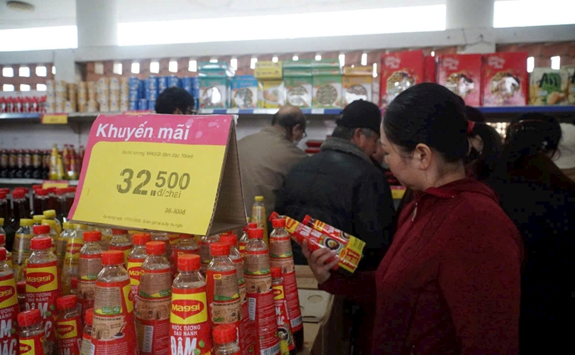 Chợ Tết phong phú với các mặt hàng thiết yếu như: gạo mắm muối, gia vị, nước ngọt các loại, bánh kẹo mứt, đồ dùng bếp…