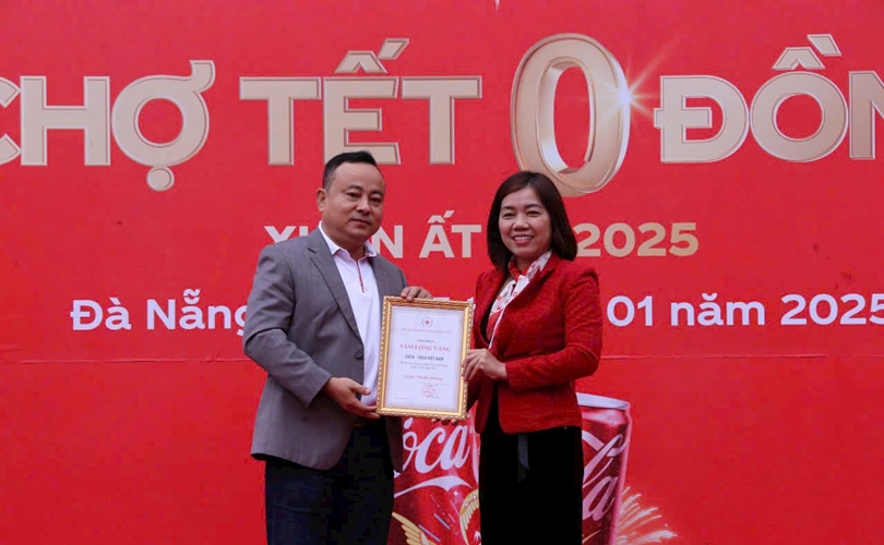Coca Cola Việt Nam trao bảng tượng trưng hỗ trợ chương trình "Chợ Tết 0 đồng" trị giá gần 760 triệu đồng cho Hội Chữ thập đỏ TP Đà Nẵng.