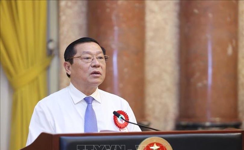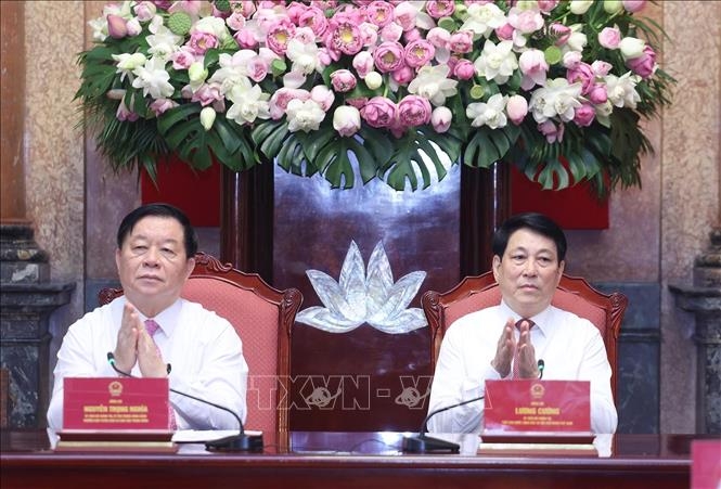 Chủ tịch nước Lương Cường và Trưởng Ban Tuyên giáo và Dân vận Trung ương Nguyễn Trọng Nghĩa dự buổi gặp mặt các nhà báo tiêu biểu toàn quốc.