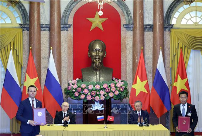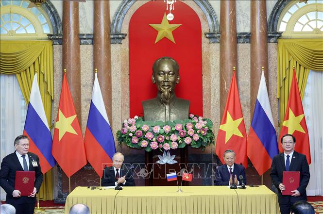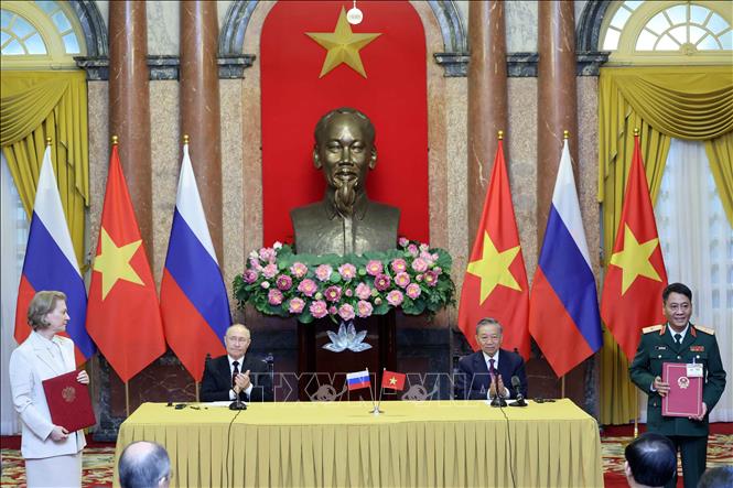 Chiều 20/6, tại Phủ Chủ tịch, sau khi kết thúc hội đàm, Chủ tịch nước Tô Lâm và Tổng thống Liên bang Nga Vladimir Putin chứng kiến trao các văn kiện đã ký kết giữa hai nước và gặp gỡ báo chí.