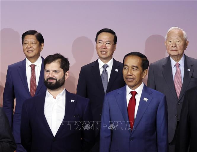 Trong chương trình tham dự Tuần lễ Cấp cao Diễn đàn Hợp tác kinh tế châu Á - Thái Bình Dương (APEC) 2023, sáng 16/11/2023 (theo giờ địa phương), tại thành phố San Francisco, Hoa Kỳ, Chủ tịch nước Võ Văn Thưởng dự phiên chụp ảnh chung với các Nhà lãnh đạo kinh tế APEC.