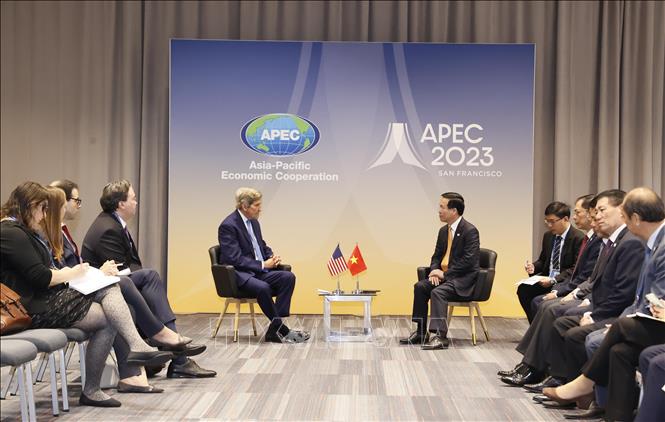 Trong chương trình tham dự Tuần lễ Cấp cao Diễn đàn Hợp tác kinh tế châu Á - Thái Bình Dương (APEC) 2023, sáng 16/11/2023 (theo giờ địa phương), tại thành phố San Francisco, Chủ tịch nước Võ Văn Thưởng tiếp Đặc phái viên của Tổng thống Hoa Kỳ về khí hậu John Kerry.